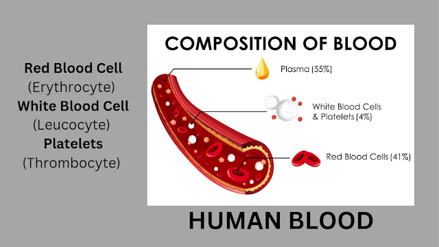 Blood has two compositions; Solid part and Liquid part. Solid part is called Cells / Corpuscles that is 45% of the blood composition and Liquid part is called Plasma that is 55% of the blood composition.